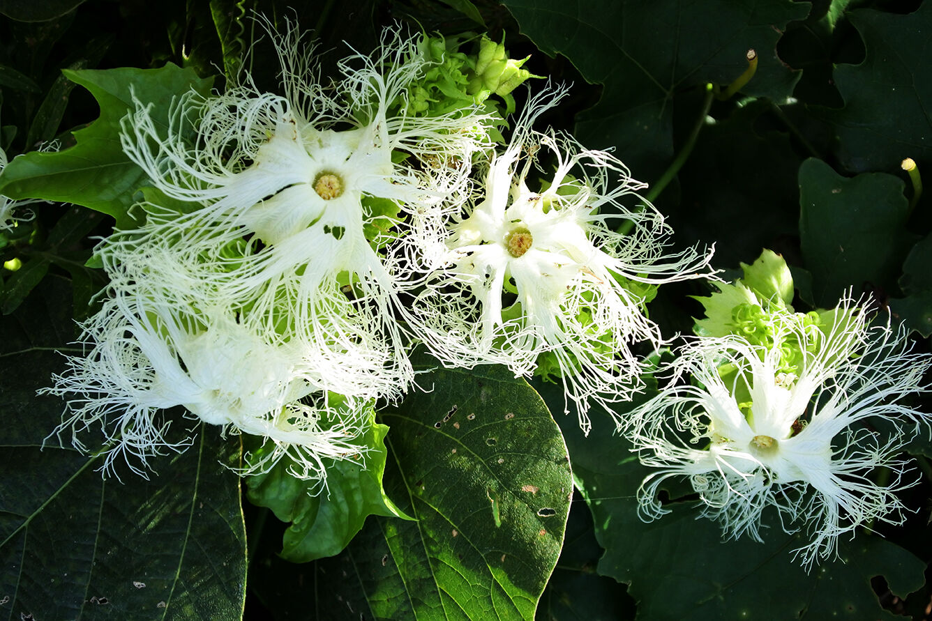 今朝も散歩道で見かけたカラスウリの花などうpしとこ。